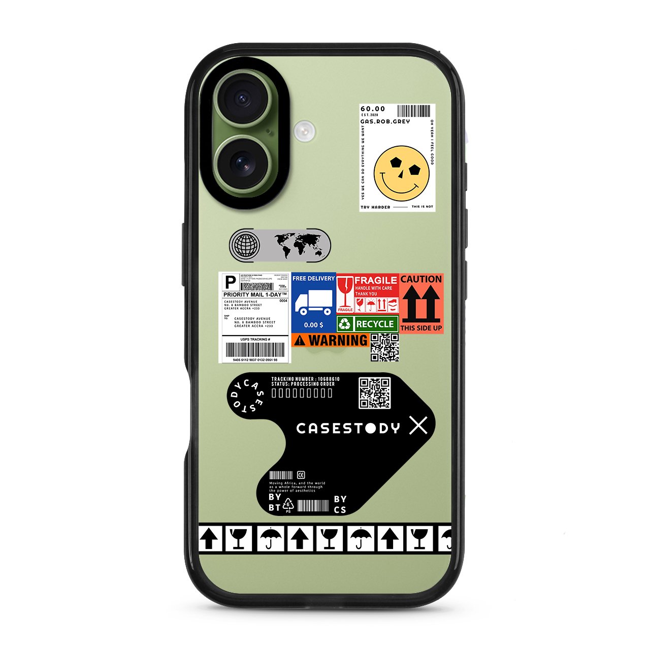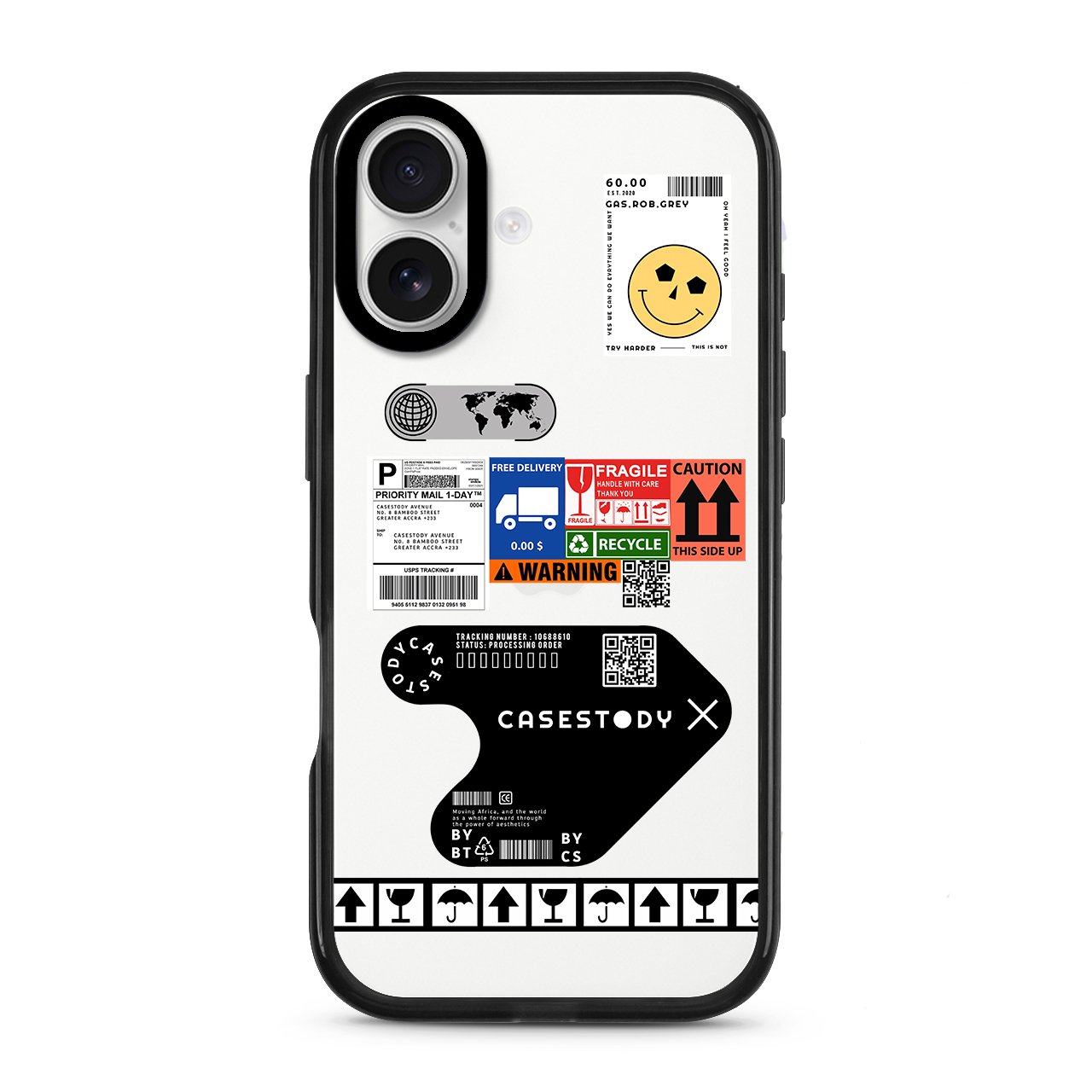 The CC Express Case is inspired by shipping labels, tracking codes, and fast global delivery culture. The design features barcodes, warning signs, delivery icons, and logistics graphics, creating a strong industrial and modern look. It represents movement, speed, and staying connected across borders.