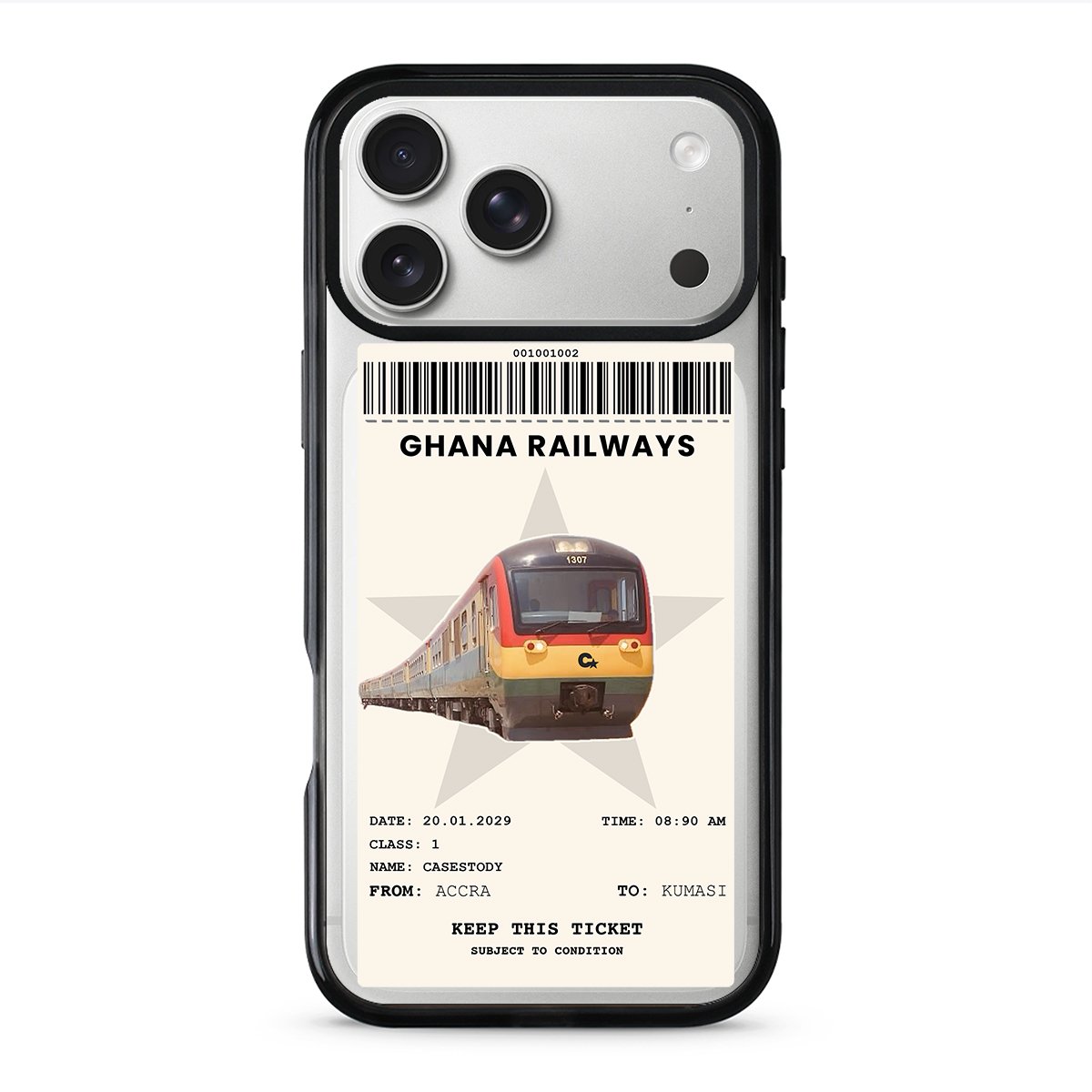 The Ghana Railway Case is inspired by the classic railway ticket and the historic journey between Accra and Kumasi. The design looks like a real train ticket, complete with route details, date, time, and class. It represents travel, connection, and movement across Ghana.