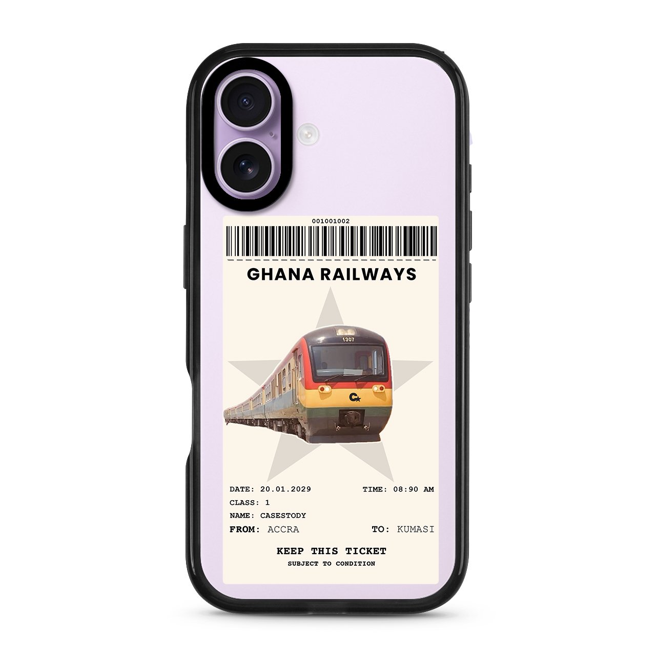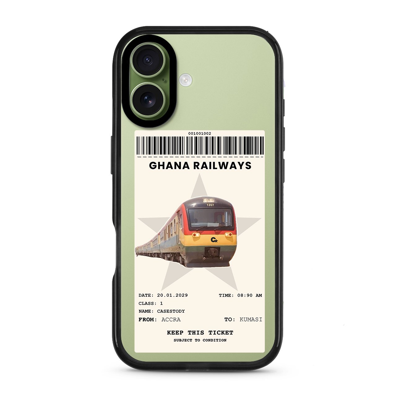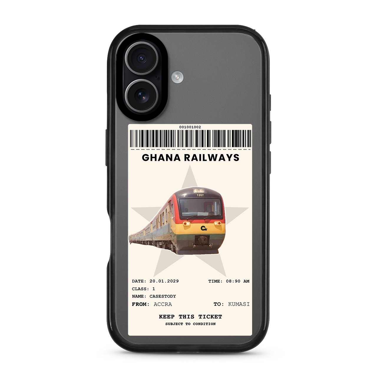 A vintage ticket-style phone case inspired by Ghana’s railway journey from Accra to Kumasi.