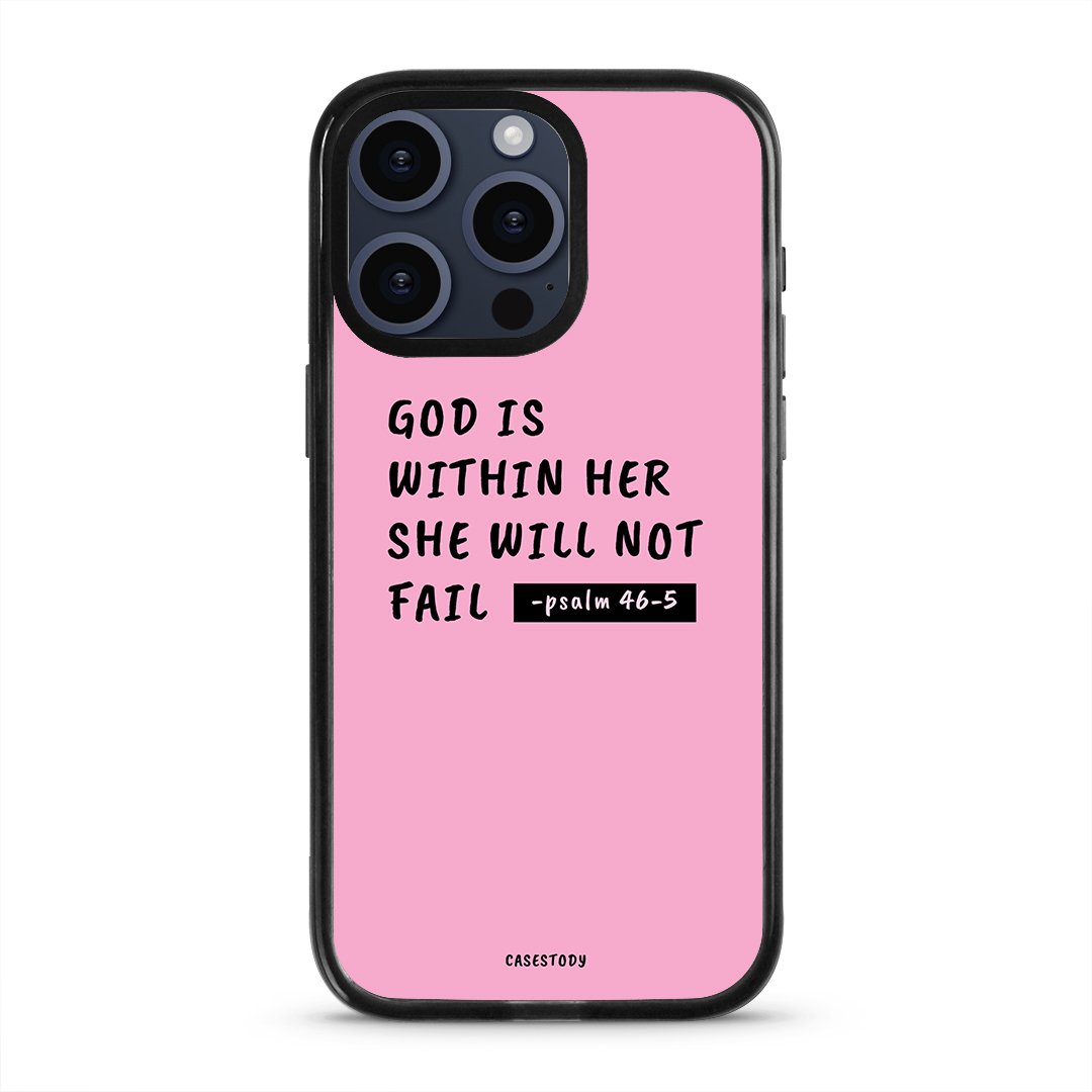 The God Within Her Case is inspired by faith, strength, and inner confidence. The soft pink background creates a calm and gentle feel, while the scripture from Psalm 46:5 delivers a powerful message of reassurance and belief.