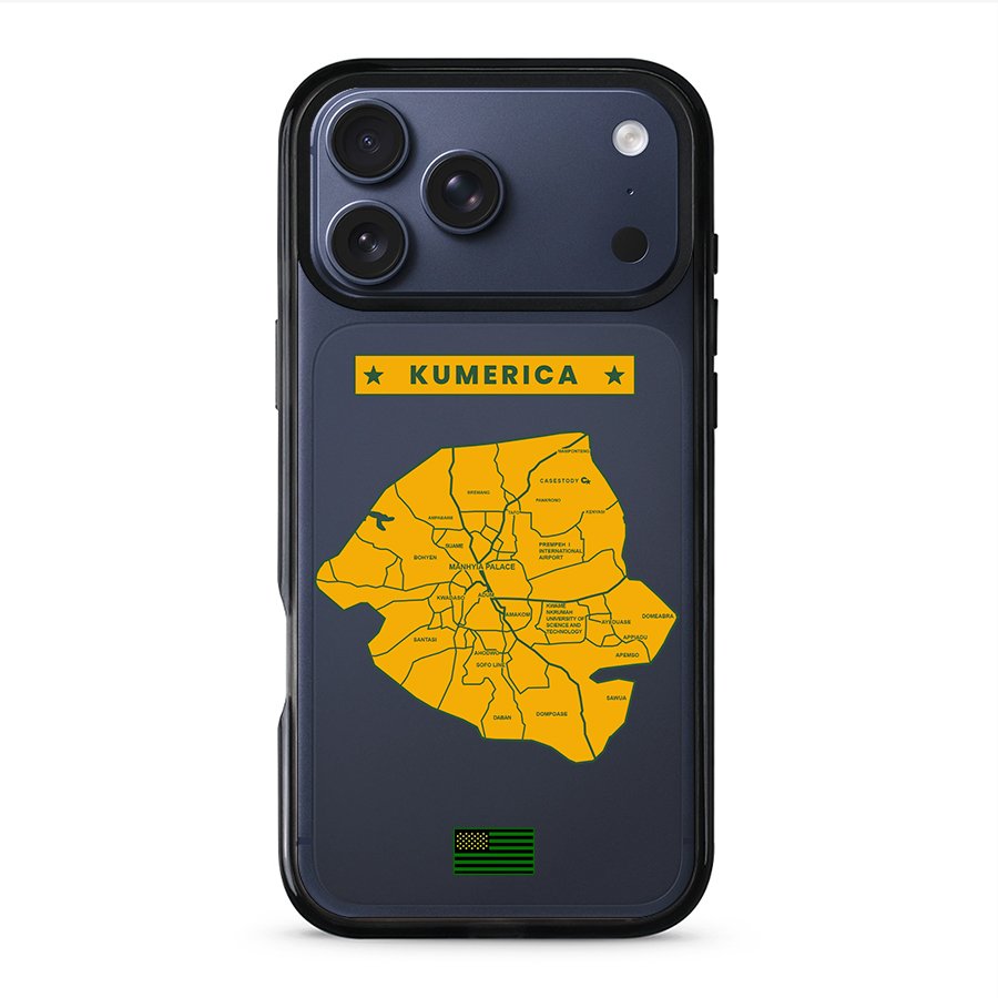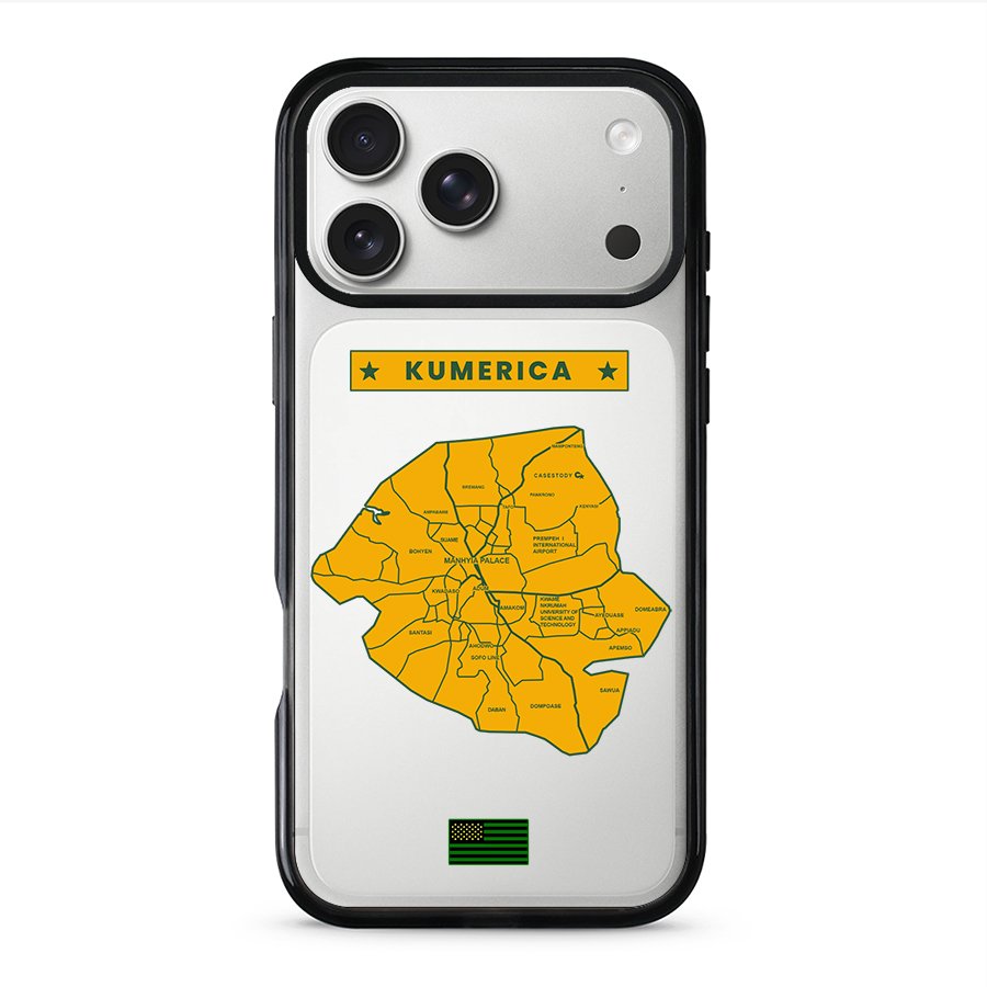 A bold phone case featuring a map of Kumasi, inspired by the Kumerica movement and city pride.